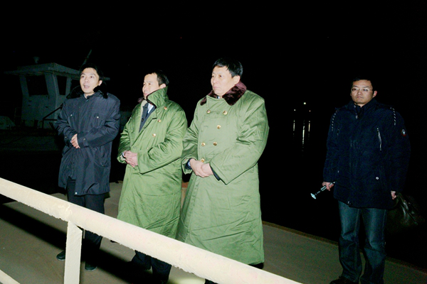 夜晚的黃河浮橋上冷風刺骨,氣溫低達-8℃。馬貴鎖指揮長與龐濤處長根據浮橋結構,研究部署攔截壩敷設方法。全體突擊隊員與渭南市、合陽縣環保局工作人員從大卡車上卸下鋼絲繩、扳手、鉗子、活性炭包等器材器具,隨時準備敷設攔截壩。