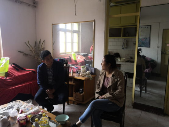 圖為工會主席周青在困難職工邱霞家中座談