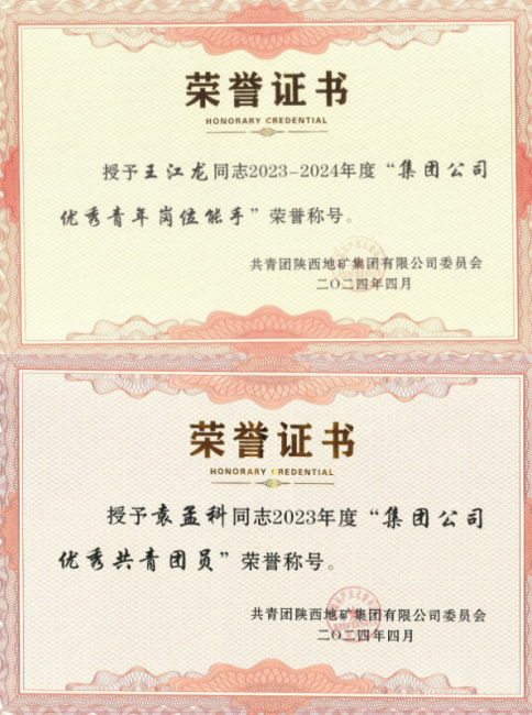 4月26日,在陜西地礦集團團委慶祝中華人民共和國成立75周年團青先進表彰暨“青春為中國式現代化挺膺擔當”主題培訓會上,我公司王江龍同志榮獲陜西地礦集團2023-2024年度“優(yōu)秀青年崗位能手”稱號,袁孟科同志榮獲陜西地礦集團2023年度“優(yōu)秀共青團員”稱號。