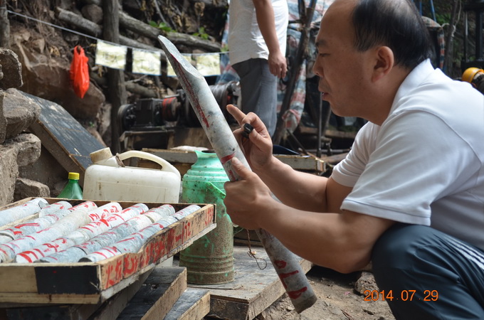 該項(xiàng)目是我隊(duì)繼小秦嶺整裝勘查潼關(guān)自有礦權(quán)區(qū)中深部探礦系統(tǒng)工程之后的又一探礦項(xiàng)目。在總公司領(lǐng)導(dǎo)的關(guān)心支持下,隊(duì)主要領(lǐng)導(dǎo)非常重視,多次前往項(xiàng)目實(shí)施地進(jìn)行現(xiàn)場(chǎng)檢查指導(dǎo)。目前,項(xiàng)目相關(guān)手續(xù)辦理及鉆探施工正有序進(jìn)行,總體進(jìn)展順利,鉆孔不同深度見有多層礦化。在檢查ZK503提取的巖心時(shí),王隊(duì)長手持地質(zhì)放大鏡仔細(xì)查看,他要求施工和相關(guān)技術(shù)人員要隨時(shí)注意巖心變化情況,特別對(duì)不同標(biāo)高段出現(xiàn)的不同地質(zhì)情況要認(rèn)真記錄、仔細(xì)分析、及時(shí)報(bào)告,不能漏掉任何細(xì)節(jié)。