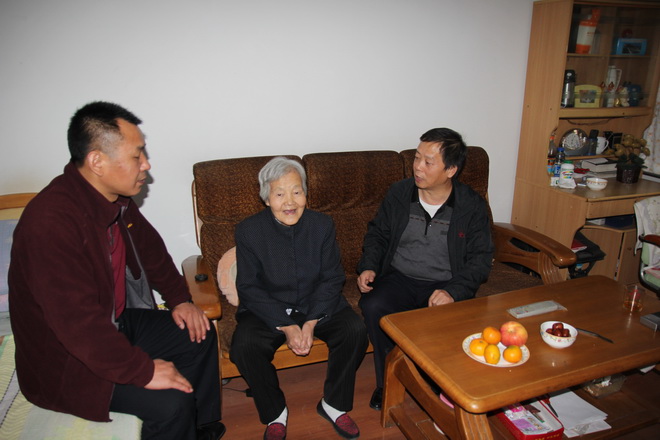 “今天您過節(jié)了,我們來看看您,也祝福您,希望您健康長壽。”隊黨委書記王戰(zhàn)社一進(jìn)門就親切地握著劉明簡老人家的手說,并送上慰問品。老人高興地連聲說“謝謝”。在與老人及其親屬親切交談中,了解到老人身體健康,而且還經(jīng)常做家務(wù)、晨煉運動時,連連稱贊老人身體好,有福氣,說:“家庭和睦、兒孫孝順、心胸開闊,是老人健康長壽的重要原因。”