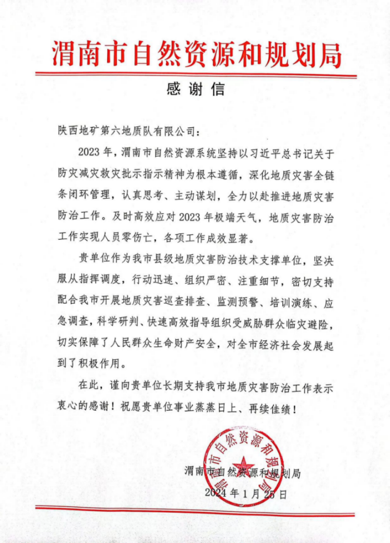 2024年1月26日,渭南市自然資源和規(guī)劃局向我公司發(fā)來感謝信,對陜西地礦第六地質(zhì)隊有限公司為渭南市地質(zhì)災(zāi)害防治工作做出的貢獻和辛勤付出表示衷心的感謝。